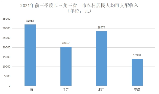 根據國家統計局公布的數據顯示,2021年前三季度,長三角三省一市農村居民人均可支配收入均超過了全國平均水平(13726元)。其中,上海市農村居民人均可支配收入達到31985元,位居全國第一;浙江則以28474元位居全國第二;江蘇為20267元,居全國第五;安徽為13988元,居全國第十。