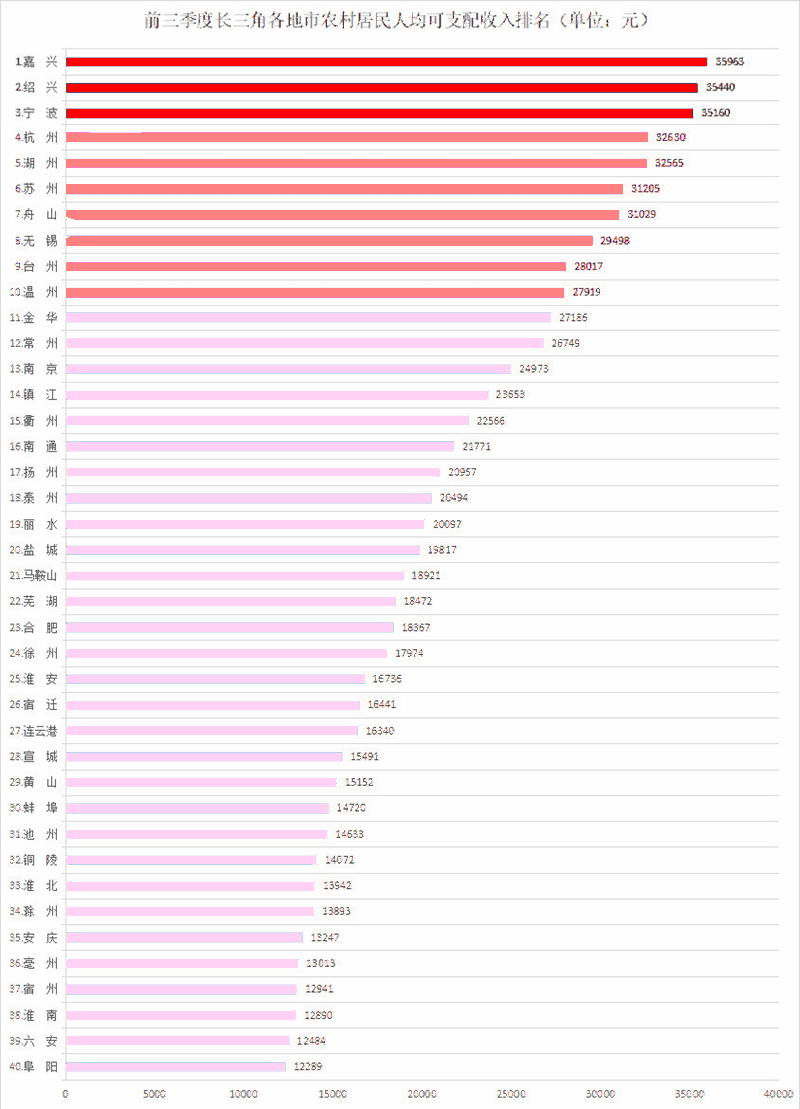 前三季度長三角各地市農村居民人均可支配收入排名中,嘉興市、紹興市、寧波市位列前三甲。其中,嘉興市農村居民人均可支配收入達35963元,已經連續17年位居全國第一。