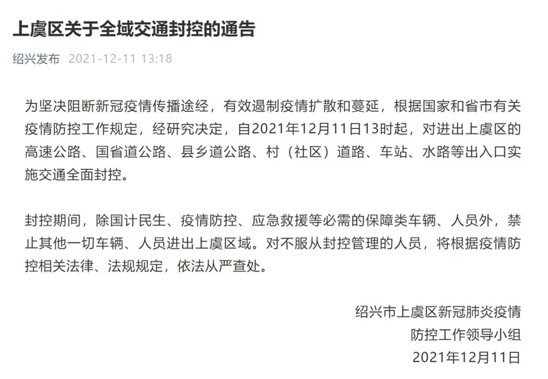 紹興市上虞區新冠肺炎疫情防控工作領導小組12月11日發布通告,為堅決阻斷新冠疫情傳播途經,有效遏制疫情擴散和蔓延,根據國家和省市有關疫情防控工作規定,經研究決定,自2021年12月11日13時起,對進出上虞區的高速公路、國省道公路、縣鄉道公路、村(社區)道路、車站、水路等出入口實施交通全面封控。
