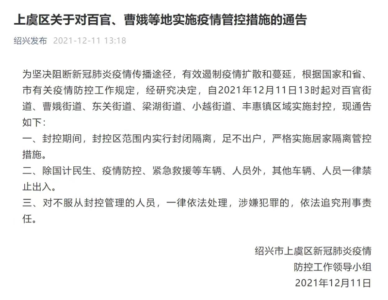 紹興市上虞區新冠肺炎疫情防控工作領導小組12月11日發布通告,對上虞百官、曹娥等地實施疫情管控措施。