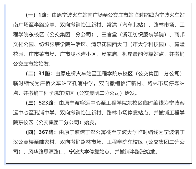 12月10日寧波公交集團發布通知,為滿足市民出行需求,結合疫情防控實際情況,集團對部分線路運營班次進行適當調整。其中,1路、31路、367路、523路同步實施臨時雙向縮線運營。