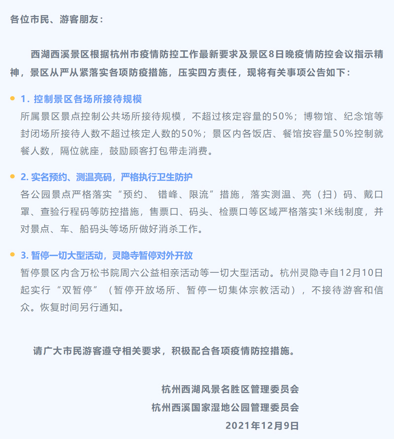 西湖西溪景區12月9日發布通知,進一步控制景區各場所接待規模,暫停一切大型活動,并對游客進行實名預約、測溫亮碼等管控。