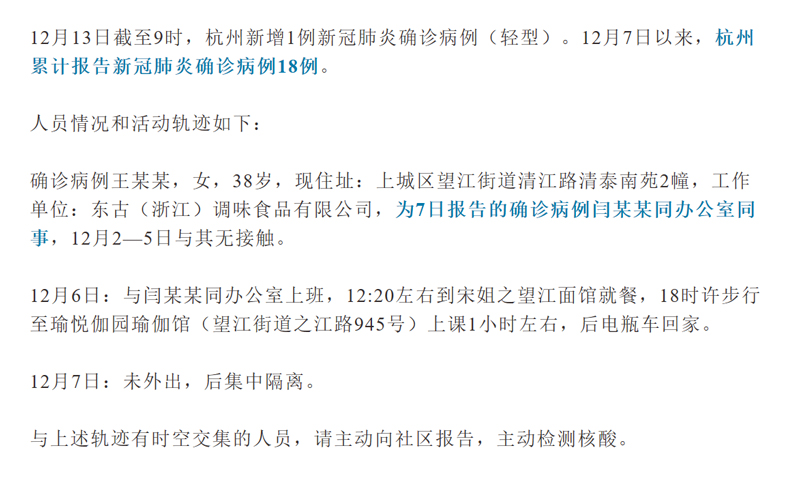 12月13日10點13分,杭州發布通報:杭州新增1例新冠肺炎確診病例(輕型)為集中隔離人員。