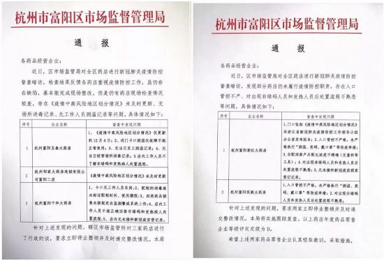 針對農貿市場、藥店、冷鏈食品等多條線的疫情防控工作,杭州市富陽區市場監管局快速響應,開展全面檢查。截至12月13日12點28分,4家農貿市場經營戶、5家零售藥店被責令停業整頓。