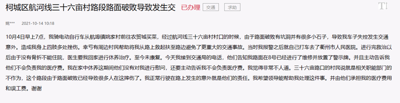 近日,有衢州市柯城區網友在人民網“領導留言板”上留言,自己騎車路過當地航河線三十六畝村村口時,由于路面破敗有坑洞致車子失控發生交通事故。