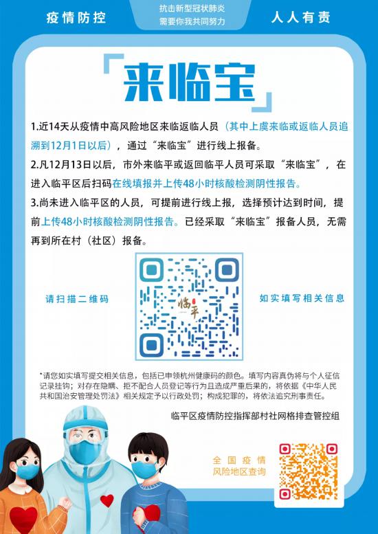 臨平發布了“來臨寶”公眾端。排查端通過掃二維碼,外地回杭人員可在線申報,登記詳細信息,上傳核酸檢測結果。從哪里來,該怎么管等資料一目了然,便于屬地掌握全面信息,研判后落實精準管控,防控復雜疫情。同時,排查數據由臨平區數管局保障數據安全,確保個人信息不外泄。