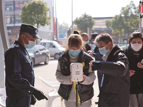 12月18日上午,在位于臺州市椒江區章安街道華景村的章安綜合市場門口,疫情防控人員正在查驗進入市場市民的健康碼和行程碼,并要求測溫。受浙江省內疫情影響,為減少人員聚集,確保群眾生命健康安全,12月17日起,椒江各街道暫停農村集市趕集活動。(聶楊波)