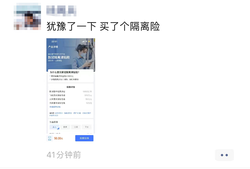“同事推薦,我也購買了一份新冠隔離津貼險,出門在外有個保障!痹诤贾菔捝侥郴ヂ摼W企業工作的小金這兩天剛剛購買了一份眾安保險推出的新冠隔離津貼險,他表示,自己之所以選擇這份保險,就是考慮自己萬一成為密切接觸者或踏進了中高風險區,“綠碼”不保還可能被集中隔離觀察,不僅誤工還要自掏食宿等費用,“擁有一份新冠隔離津貼險,可以盡最大可能彌補損失!