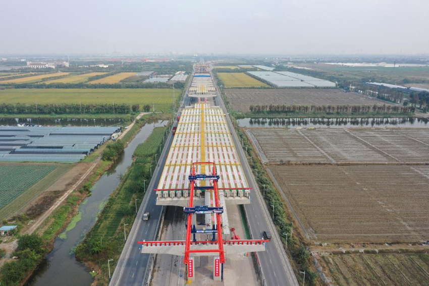 杭紹甬高速杭紹段項目馬鞍互通主線橋首片鋼板梁成功架設