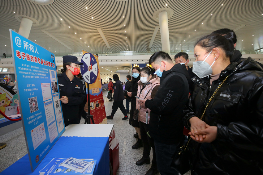 1月17日上午,在杭州東站進站口附近,一場特殊的“送福送平安”活動在此上演。杭州鐵路公安處采取“小宣傳,大平安”模式,在杭州東站進站口附近擺放宣傳臺,民警向來往旅客介紹“電子臨時乘車身份證明”申領流程和注意事項,講解鐵路出行途中防疫、防盜、防電信詐騙等知識,并通過“幸運轉盤”隨機向旅客贈送紀念用品。