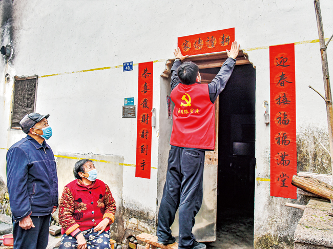 1月18日,在距離金華城區50多公里的金華市婺城區沙畈鄉周村,婺城區文化館的黨員志愿者將大紅福字、春聯送到低保戶家中,并幫助腿腳不便的老人將福字、春聯張貼好。據了解,由于疫情防控需要,今年婺城區文化館改變過去請書法家現場寫春聯的做法,由全區23名書法家在家寫好福字、春聯,再由志愿者送到全區10多個鄉鎮、4家企業和街道社區的退役軍人、困難戶、低保戶、殘疾人手中。(吳潮宏)