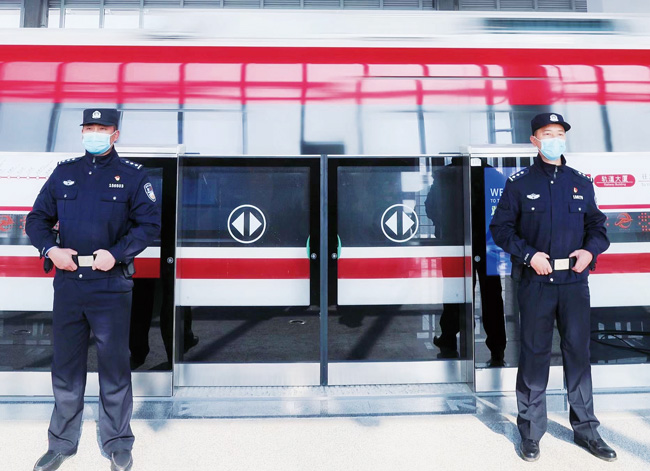 1月20日,一列輕軌駛入位于金華市金義新區的軌道大廈站,兩名軌道警察嚴陣以待,隨時為市民提供幫助。金義東市域軌道交通工程金義段1月11日開通試乘。據悉,作為市域軌道專業安保力量,軌道警察是“全新警種”,以年輕民警為主要力量。(倪國棟)