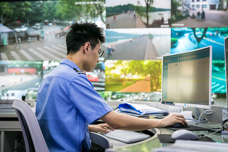 杭州岳廟派出所綜合指揮室依托轄區內布控的智能監控攝像頭、智能卡口等設備,通過對“人、車、物、證、碼”等要素進行精準識別和數據匯集,構建起全景感知的數字化“智能防線”。