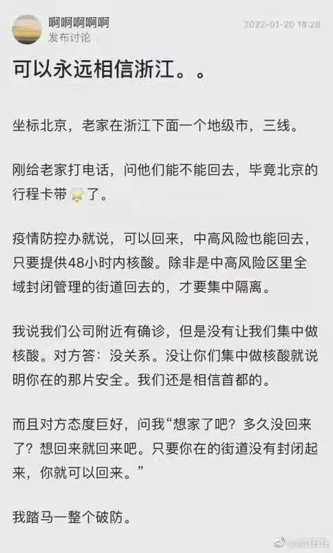近日,一則“永遠可以相信浙江”的帖子在網絡上刷屏,不少網友為浙江嘉興防控辦的溫暖回應點贊。
