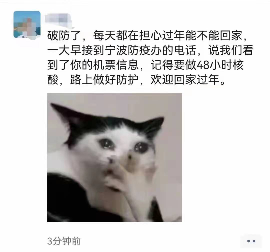 “每天都在擔心過年能不能回家……”外地工作的一位寧波人發朋友圈表示,沒想到,老家某部門工作人員看到他的機票信息,來電提醒他“記得要做48小時核酸,路上做好防護,歡迎回家過年!睖嘏氈碌膰诟雷屓酥焙簟捌品懒恕。