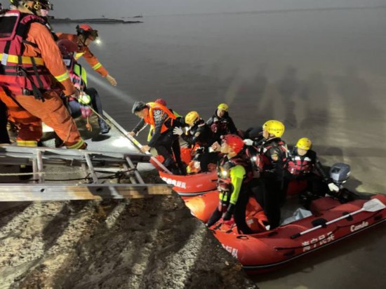 17時40分,海寧消防救援人員和海豹救援隊兩艘沖鋒舟根據定位也到達事發地點,成功將被困人員拉上沖鋒舟,準備轉移到岸上安全地帶。此時,天色已暗,江面上能見度很低,救援人員打開照明燈以及?堪渡系南儡嚧鬅,為營救被困人員的沖鋒舟指引回程的“生命通道”。隨后,3名被困人員被送往醫院檢查。據悉,目前均生命體征平穩。