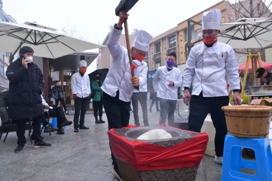 在龍躍路步行街,舞臺上溫州鼓詞、戲曲等表演輪番上場;舞臺下魚餅鮮香、年糕米香四溢。雖然下著毛毛細雨,但市民依舊熱情不減。搗年糕、蒸松糕、捏米塑、畫糖畫等攤位上更是排起了長隊,引來了圍觀,市民臉上都洋溢著喜悅的笑容。