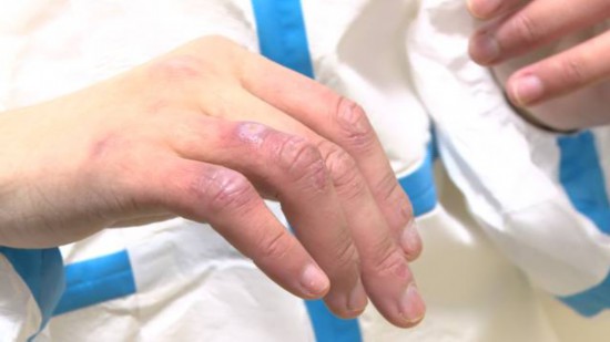 “好幾年沒有長凍瘡了,今年已經長了七八個,實在是太疼了!痹捳Z間,臨平區一院核酸采樣點工作人員李小莉慢慢脫下了防護手套。