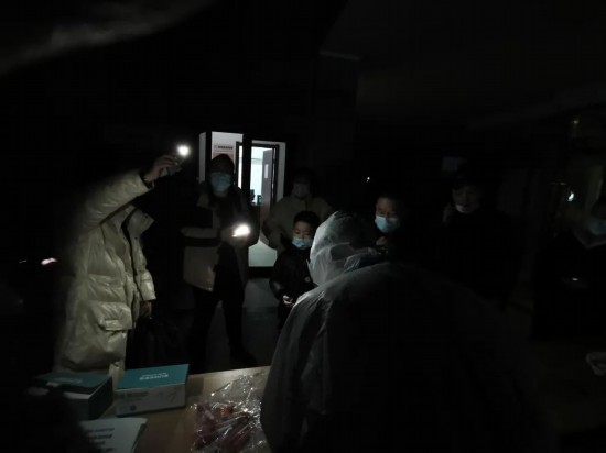 由于部分點位設在樓道架空層,部分區域因定時照明原因短時間內無法恢復照明,給采樣工作造成了影響。已經完成采樣的市民不顧嚴寒,主動留下和工作人員一起舉起手機,用手機的“手電筒”功能為采樣“送去光明”,現場氣氛和諧有序。