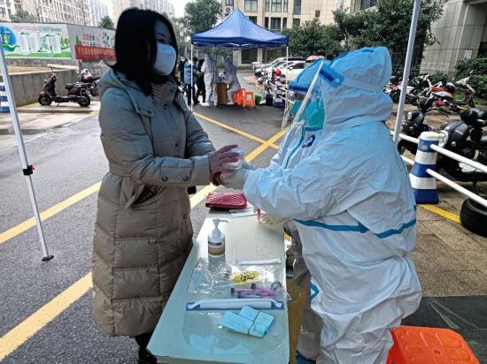 這幾天雨雪來襲,氣溫大幅下降,但核酸采樣點的醫護人員依舊在寒風中堅守。