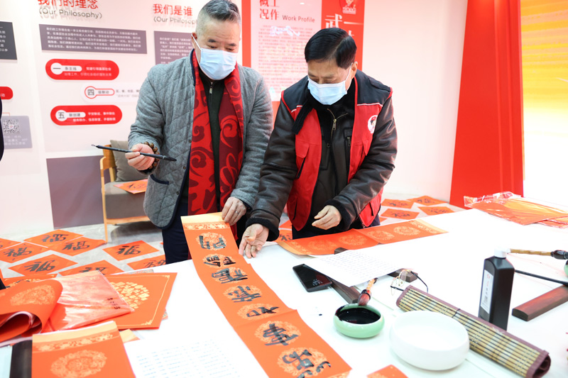 “受疫情影響,許多人不能回家過年,能寫個‘!譃樗麄兯腿ヒ稽c溫暖,我很開心!”正在紅色宣紙上認真書寫祝福的韓天林笑著說。