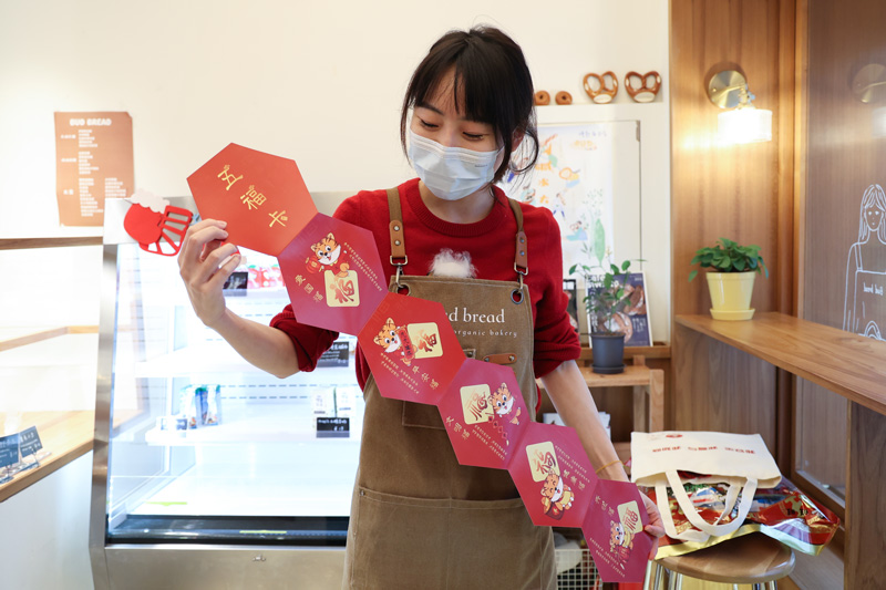 “哇!這張五?ㄌ蓯哿,我要把它掛在店內!”收到“虎”禮包的面包店店員拿出袋內的五?,驚喜地對“武林大媽”說道,“感謝你們冒雨送來的祝福,我會嚴格遵守防疫措施,平安文明過節的!
