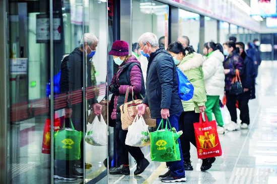 2月6日,金華市區金義東市域軌道交通站臺上,乘客正雙手提著年貨進入車廂。自1月11日開通試乘,金義東市域軌道交通金義段迎來了首個春節。節日期間,不少市民選擇乘坐軌道交通走親訪友,成為新年新時尚。(胡肖飛)
