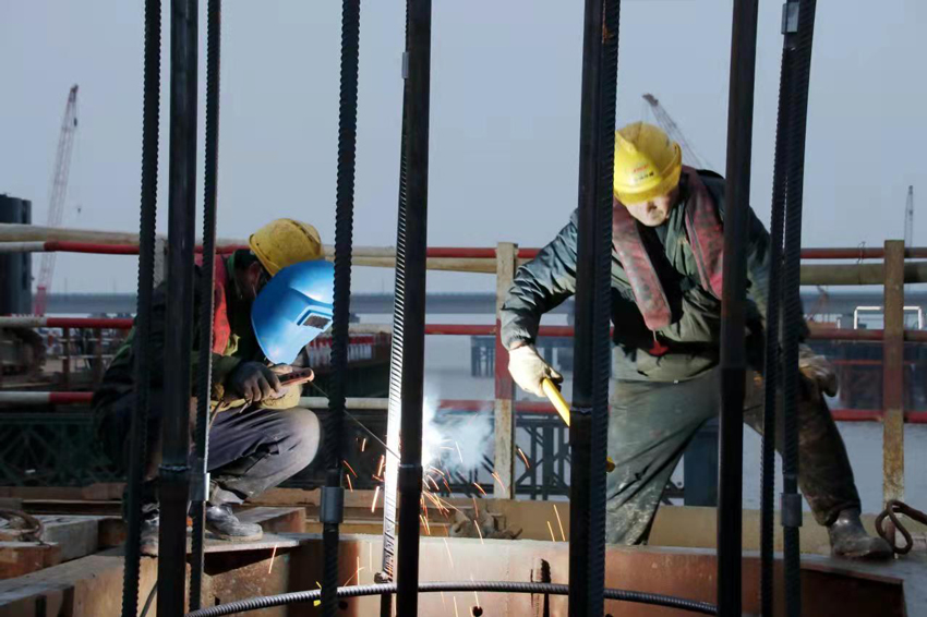 在濱;ネǖ氖┕がF場,工人們正在緊張地進行鋼棧橋的搭建工作。根據該標段相關負責人介紹,春節期間,90余名工人選擇留守工地過年,其間只作簡短的休息調整,便又投入到了施工中。同時,該標段從2月9日起全面恢復生產,項目部管理人員、各施工班組人員陸續返崗,確,F場恢復到年前的狀態,為完成一季度投資目標創造有利條件。