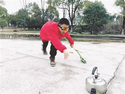 “沒有現成的器具那就就地取材,燒水壺當冰壺、海綿拖把作冰壺刷,而公園的路面比較平整,正適合模擬冰壺場地!瘪樣詈χf,他曾去芬蘭參加研學,和當地小朋友打了一場冰壺對抗賽,這場比賽讓他印象深刻。得知冰壺也是冬奧會項目后,駱宇涵決定“就模仿它了!”