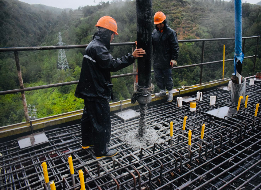 在大橋主梁的澆筑現場,技術員王傳發正和同事一起,注視著一方方混凝土緩慢灌入模板中,并逐一檢查是否振搗到位!斑@座大橋全長580米,主跨跨徑300米,主塔高約210米,是目前浙江省在建高度最高、跨徑最大的山區混凝土斜拉橋!钡谝淮瘟羰刂蛋嗟耐鮽靼l說,“今年沒在家過年,但是項目部為我們準備了年夜飯,讓我感受到了家一般的溫暖!