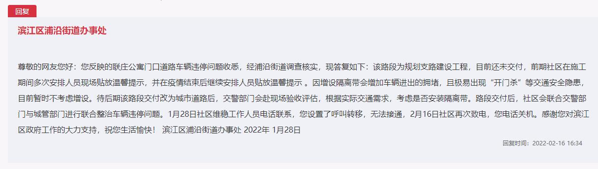 2月16日下午,聯莊社區所在的浦沿街道辦事處對網民留言進行了回復。