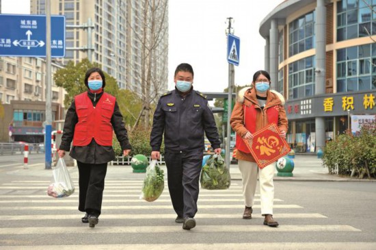 2月22日上午,嘉興南湖區解放街道凌塘社區“網格三人行”志愿者在超市精挑細選新鮮豬肉、蔬菜、豆制品等生活物資后,將“暖心菜”送到居家隔離居民家門口。