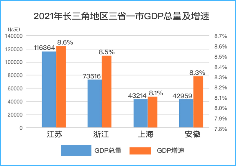 2021年,安徽和上海GDP雙雙突破4萬億元大關,浙江和江蘇GDP更分別超過7萬億元和11萬億元,堪稱全面發展。從增速來看,江蘇(8.6%)、浙江(8.5%)、安徽(8.3%)三省的GDP增速均超過國內GDP平均增速(8.1%),上海則與其持平。在增量方面,江蘇實現“萬億級增長”穩坐頭把交椅,浙江(8902億元)位居其次,安徽和上海都是4千多億,在總量和增量上呈齊頭并進之勢。