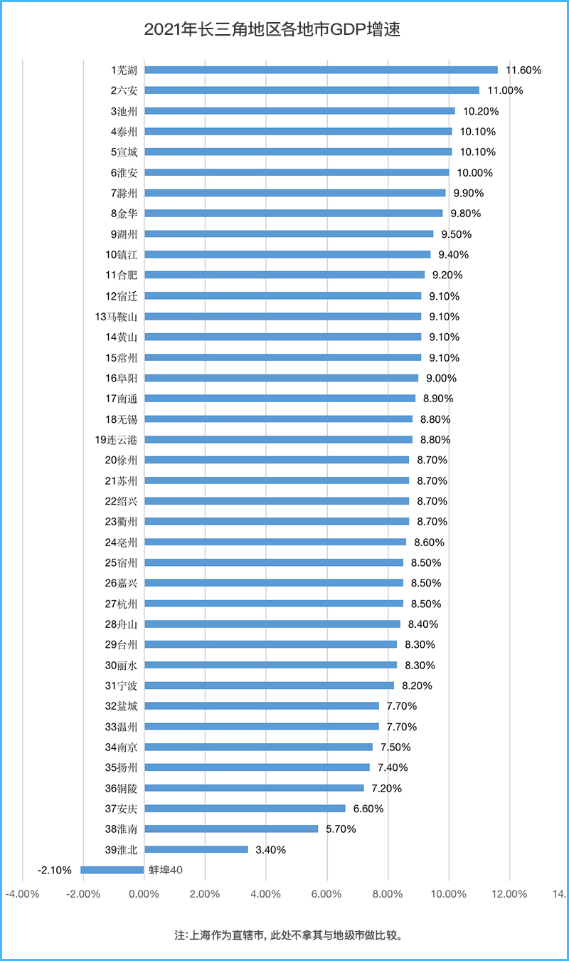 在長三角各地市GDP增速排名榜上,安徽16市中9個城市躋身Top20,然而排名最末尾的5位“選手”同樣來自安徽。其中,墊底的蚌埠成了全國少有的GDP負增長的地級市。