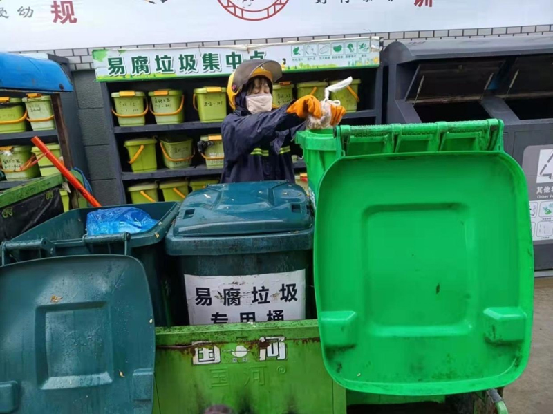 臟亂差的環境是易腐垃圾分類工作中經常會遇到的情景——晴天,垃圾容易變質發臭;雨天,濕滑的垃圾難以分類。2022年2月以來,為確保及時完成垃圾收運,垃圾分類專管員脫下被雨水打濕的口罩和打滑的手套,在惡劣的環境下堅守崗位。