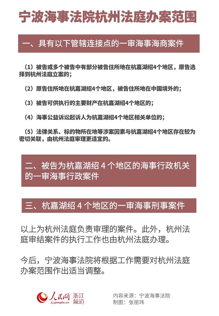 從今天起,杭州法庭正式履行法定職責,負責審理發生在杭州、嘉興、湖州、紹興四個地區的一審海事海商案件、海事行政案件、海事刑事案件,并負責辦理其審結案件的執行工作。當事人可通過網上立案、跨域立案、郵寄立案、現場立案等方式,向杭州法庭提出立案申請。