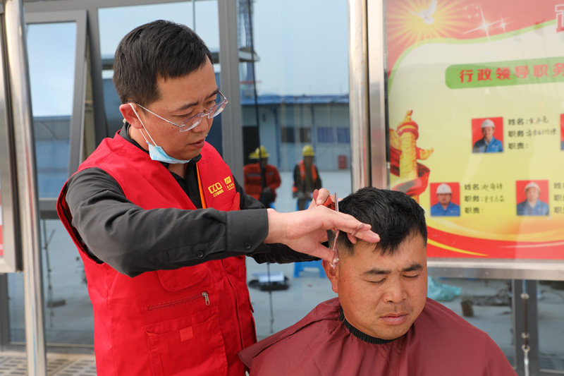 理發小分隊隊員為工人理發。金臺鐵路公司供圖
