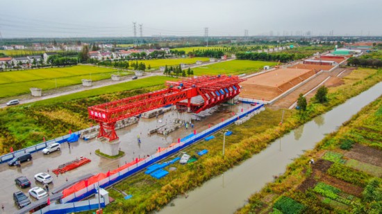滬蘇湖鐵路橋梁上部結構施工。鐵路部門供圖
