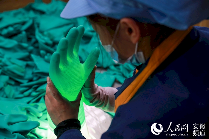 檢測員給乳膠手套做燈檢。人民網 張俊攝