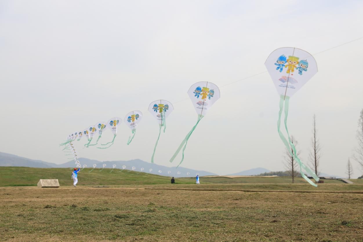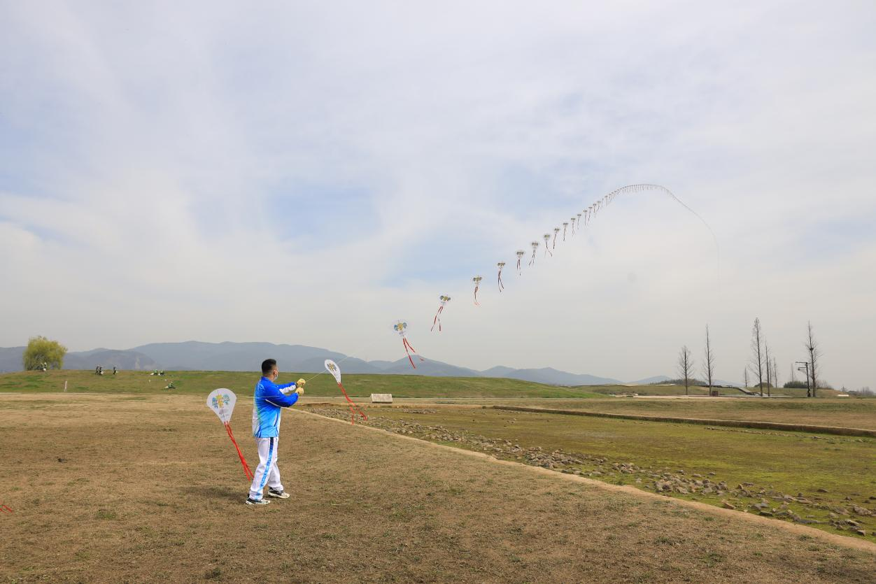 “放風箏是個力氣活。風力順當的時候,升空只要半小時,但收回來卻很費事。今天我帶了十多個人來幫忙,至少需要2小時!背痰仙瓯硎,其團隊前期考察時發現,公園的池中寺遺址區域地勢平緩開闊,周邊無高大建筑物、樹木等遮擋,十分適合風箏飛行。