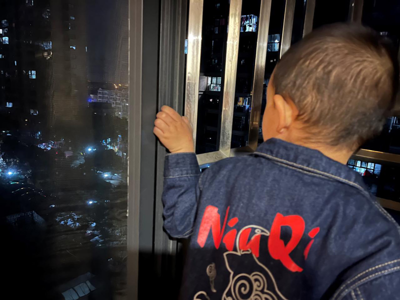 陳斌3歲的兒子透過窗戶看樓下的核酸檢測點。倪玲燕攝