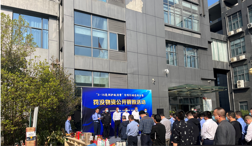 2022年3月14日,臺州玉環市市場監管局聯合該市公安局、市消保委開展“3·15亮劍護航消費”罰沒物資公開銷毀活動,對歷次專項執法行動中查獲的罰沒物資進行集中銷毀。