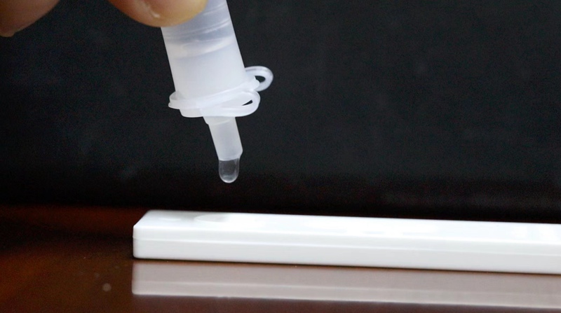 將檢測試劑中的液體垂直滴到檢測卡的S孔中。黃添奕攝