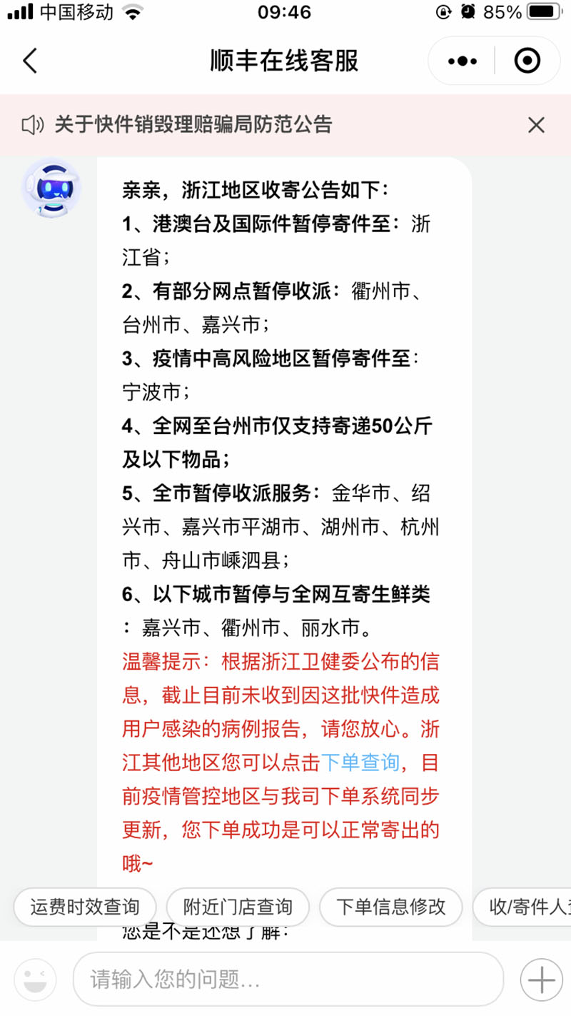 3月9日以來,杭州市共發生本土疫情3起,其中“0309余杭疫情”病例高度集中在余杭區仁和順豐速運中轉場,一場因快遞掀起的風波至今仍未平息。人民網浙江頻道了解到,順豐速運在杭州的收派服務已經暫停多日。并且由于近日浙江多地相繼報告新增本土確診病例,順豐速運小程序顯示,目前順豐速運在杭州、溫州、金華市、紹興市、嘉興市平湖市、湖州市、舟山市嵊泗縣等地區的收派服務均已暫停,嘉興市、衢州市、麗水市與全網互寄生鮮類暫停,恢復時間尚不清楚。這樣的情況讓沈祥林頗感著急又無奈。