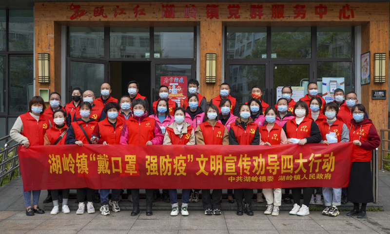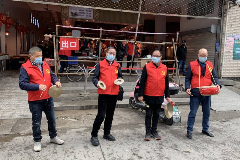 3月23日上午,他們還先后來到湖嶺中心菜市場、湖嶺橋頭,表演防疫“三句半”。同時,來自湖嶺鎮黨群服務中心、老年大學、社工站、鎮婦聯等單位的30多名志愿者走上街頭,宣傳防疫知識,提醒村民規范佩戴口罩。