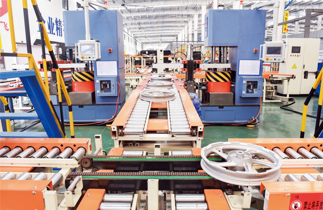 3月30日,在位于金華婺城區摩輪未來工廠生產車間里,智能生產線正在平穩運行,全自動完成設定的輪轂加工工序。該工廠被金華市和婺城區列為數字化示范企業。企業運用5G、視覺識別等新一代信息技術,大量應用工業機器人,實現柔性化生產,建成裝備數字化、工藝數字化、運營數字化的數字化工廠。用工人數比傳統項目減少58%,生產效率提升15%。(陳俊、李建林)