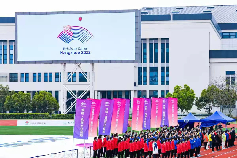 4月1日,杭州舉行亞運籌辦“決勝攻堅”誓師動員大會,余杭以“你好亞運!余杭@未來”為主題,在杭州師范大學倉前校區體育場舉行分會場活動。