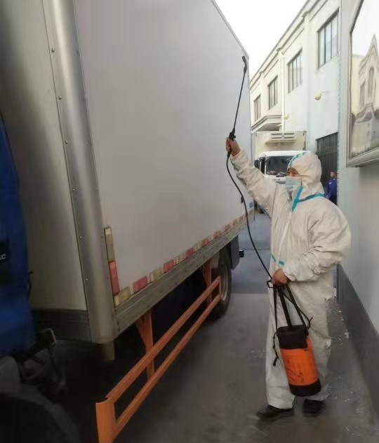 企業組織專人對入臨貨車進行消殺。星橋街道供圖
