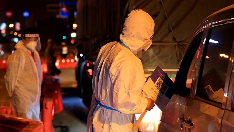 “你好,請問你有沒有攜帶通行證?如果沒有的話,你只能在這里掉頭!痹谟嗪剂间窘值啦﹫@路與霓虹路交叉口卡口,交警正在對進出杭州農副產品物流中心園區的車輛進行檢查,核實通行證、健康碼、行程碼以及核酸檢測證明后,方能予以通行。對不符合要求的車輛,則勸導其返回,重點摸排非必要過境、滯留貨車。