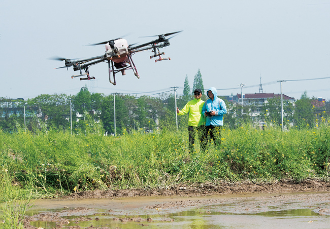 近日,在金華澧浦鎮東湖畈農田里,種糧大戶季靜波使用無人機播種早稻。季靜波2022年種植早稻2200畝,品種為金早09和金早645,無人機播種一畝地只需要1分鐘左右時間,效率高,稻種撒得均勻,人工成本大大降低。(時寬兵)
